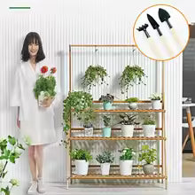 Crea un rincón verde y elegante en tu hogar con este organizador de macetas plegable y móvil. Ideal para balcones, patios o interiores luminosos.